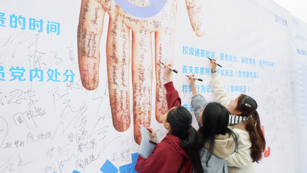 12月26日中午,食堂门口,一组主题为“作弊”的静态行为艺术展示在食堂门口悄然开展,几名“作弊”的学生静态演示了《学生手册》中所涉及的考试违规违纪行为,课桌上打出醒目的禁止标志,警醒同学们一定要遵守考场记录,文明考试。同学们纷纷在喷绘上签名,承诺文明考试、诚信有礼。学生处制作了考试专用的2B铅笔,分发给参与互动的同学。大学生自我发展中心的同学们为参与“零作弊、零挂科”班级挑战赛的班级登记,贴心地为同学们送上了“考试加油”的抱抱,截至目前,已有二十余个班级报名参与零作弊、零挂科班级挑战。