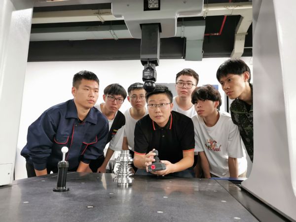 这位经常突发奇想的老师,带领学生研发、制造、改进了许多小工具,从“内外圆两用车刀”,到柑橘采摘机、老年自动洗澡机……点子多,动手能力还强,能把灵感迅速“变现”,在学生和同事们眼里,王胜老师是个特别有意思的“宝藏”老师。王胜(中)和学生一起操作工业级三坐标测量仪。