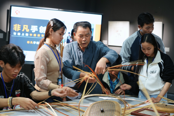 毛春良拿起一根竹条说:“同学们,竹编在中国有悠久的历史,每一根竹条都蕴含着我们祖先的智慧。”毛春良手中的竹条在灵巧地翻转、穿梭,一会儿工夫,一个精巧的竹编图案就初现雏形。留学生们目不转睛地看着,几位留学生凑上前去,仔细观察这神奇技艺。