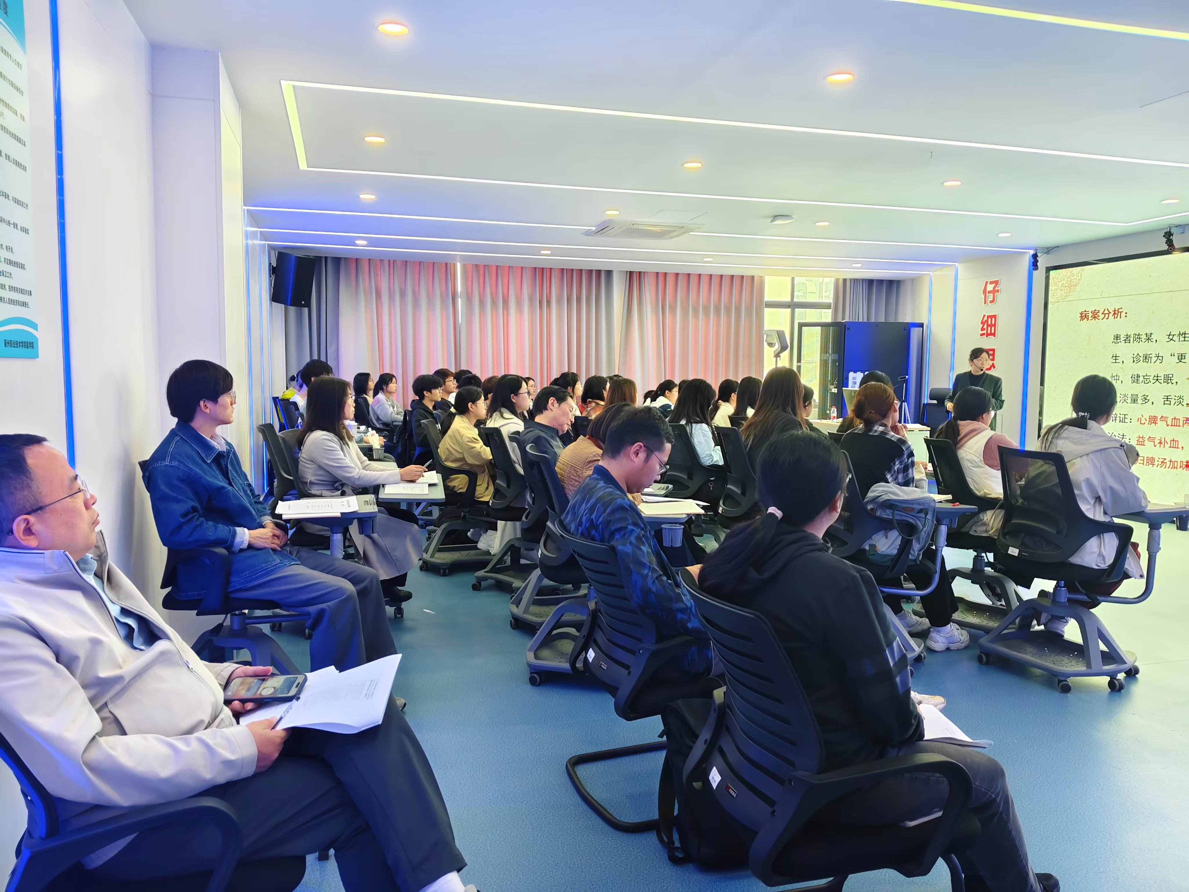 罗斌玉老师以饱满的热情和亲和力,讲述了脏与脏之间(心与肺、脾、肝三脏之间)的关系,课堂教学内容充实饱满,教学过程自然流畅。通过对临床典型案例的分析和讨论,充分调动了学生学习的积极性,锻炼了学生的临床思维能力,课堂师生互动良好,学生参与度高,气氛活跃。