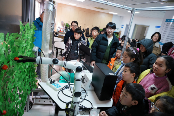 庄千洋带着学员们来到另一间实验室。展示台上,模拟的小番茄植株栩栩如生,智能采摘机器人的机械臂高高举起,等待着出征的指令。庄千洋介绍了番茄等作物的精准识别与定位技术,当庄千洋启动机器人,机械臂灵活地穿梭在植株间,精准地找到目标番茄并模拟采摘时,现场的气氛一下子热烈起来。