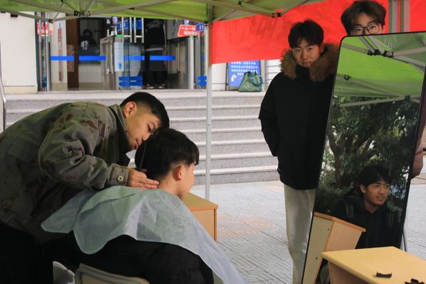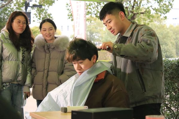 “同学们看,修剪发梢要像调试代码一样精准!”2号公寓楼前,平日执教课堂的郑老师化身“托尼导师”,架起直播设备开展义剪教学。白围裙、理发剪、分层修剪技巧演示,搭配居家护发知识讲解,直播间弹幕瞬间沸腾:“原来碎发要逆着梳!”“老师这手法比算法还丝滑!”线下同步开设公益剪发服务,10名学生在轻柔的剪刀开合间焕发新颜,师生互动中传递别样温暖。